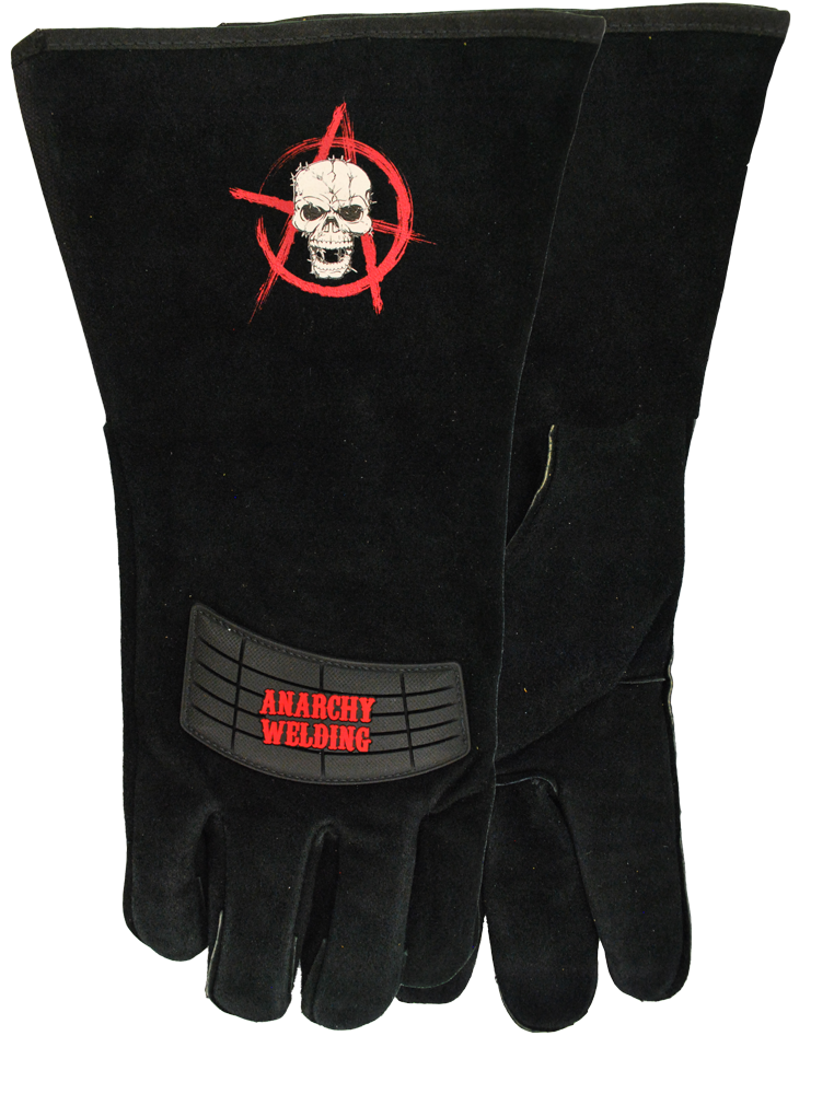 Split cowhide leather, cotton jersey shell, flame resistant heavy duty rubber on knuckle bar, reinforced welted seams, wing thumb, stitched with Kevlar® thread, gauntlet style cuff