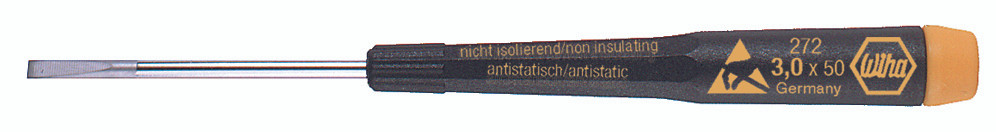 Precision ESD Safe Slotted Screwdriver. .8mm x 40mm. 4.7"/120mm OAL. Blade high alloy chrome-vanadium-molybdenum steel, hard chrome finish. Handle manufactured from impact resistant, dissipative material. Rotating cap for precise turning & control with fingertip.