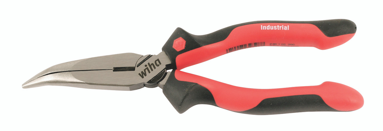 Industrial SoftGrip 40° Bent Long Nose Pliers. 6.3"/160mm OAL. AWG #10. Extra long cutters for flat and round wires. Gripping surfaces serrated in parts. Two component Industrial SoftGrip ergonomic handles, anti-slip for safe gripping.